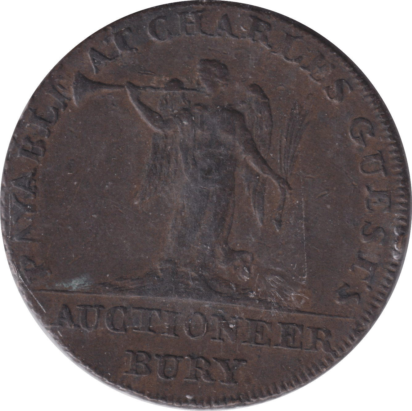This 1795 Halfpenny Auctioneer Token from Bury St Edmunds is a remarkable piece of numismatic history. Issued during a period when tokens were commonly used for trade and commerce, this halfpenny features distinct markings identifying its auctioneer origin. Its historical value and rarity make it a prized addition for serious collectors seeking authentic Georgian-era tokens with a local provenance. Ideal for those studying trade practices or expanding a specialized auctioneer token collection.