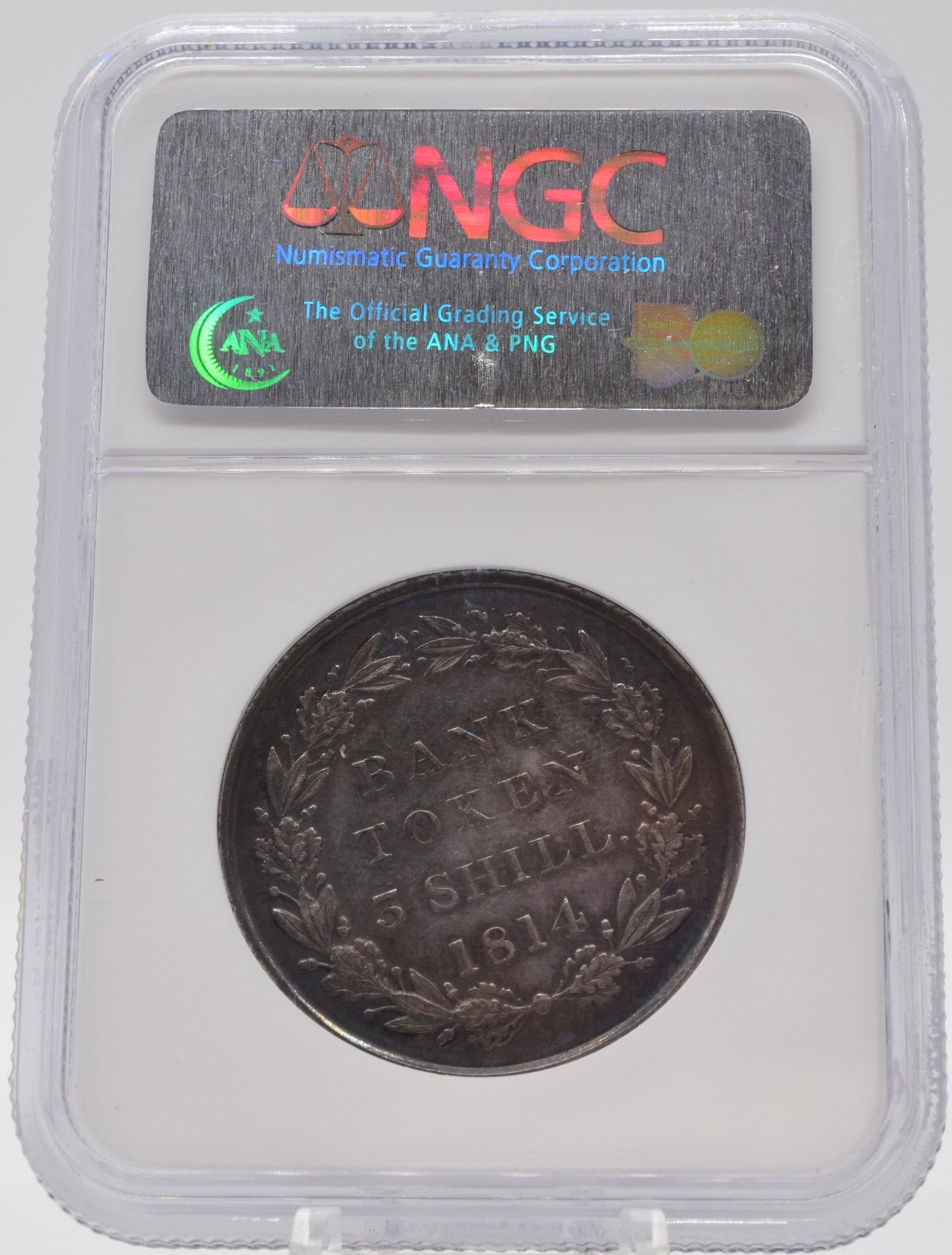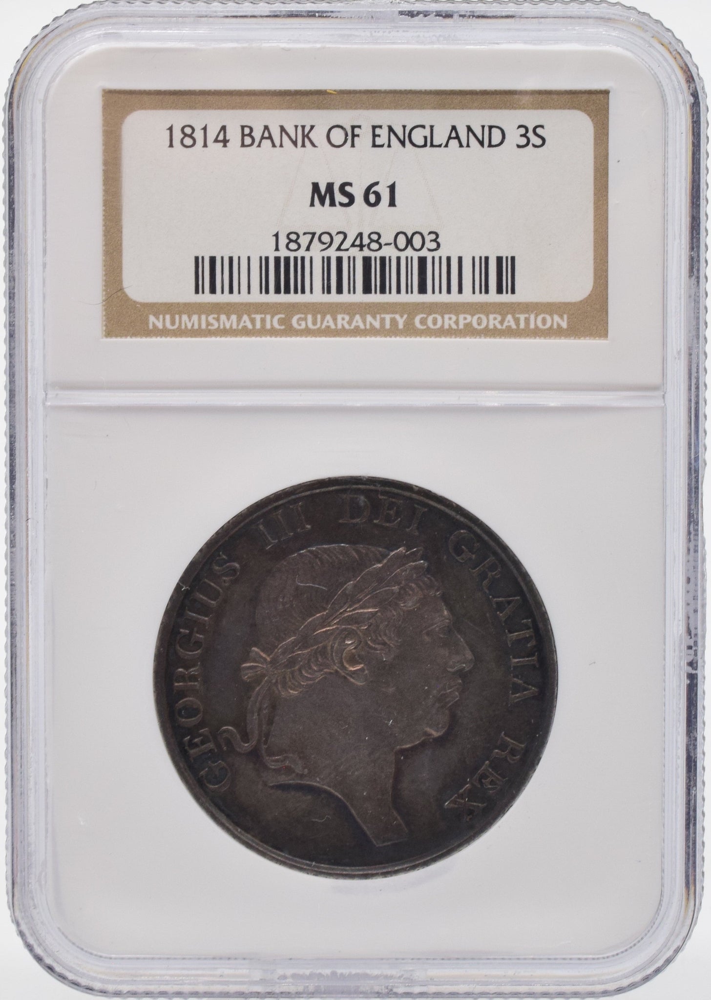 This 1814 Bank of England Three Shillings Token, graded MS61 by NGC, is a rare historical piece. With a high grade and professionally certified, it is a valuable addition to any collection. Own a piece of British history with this impressive token.