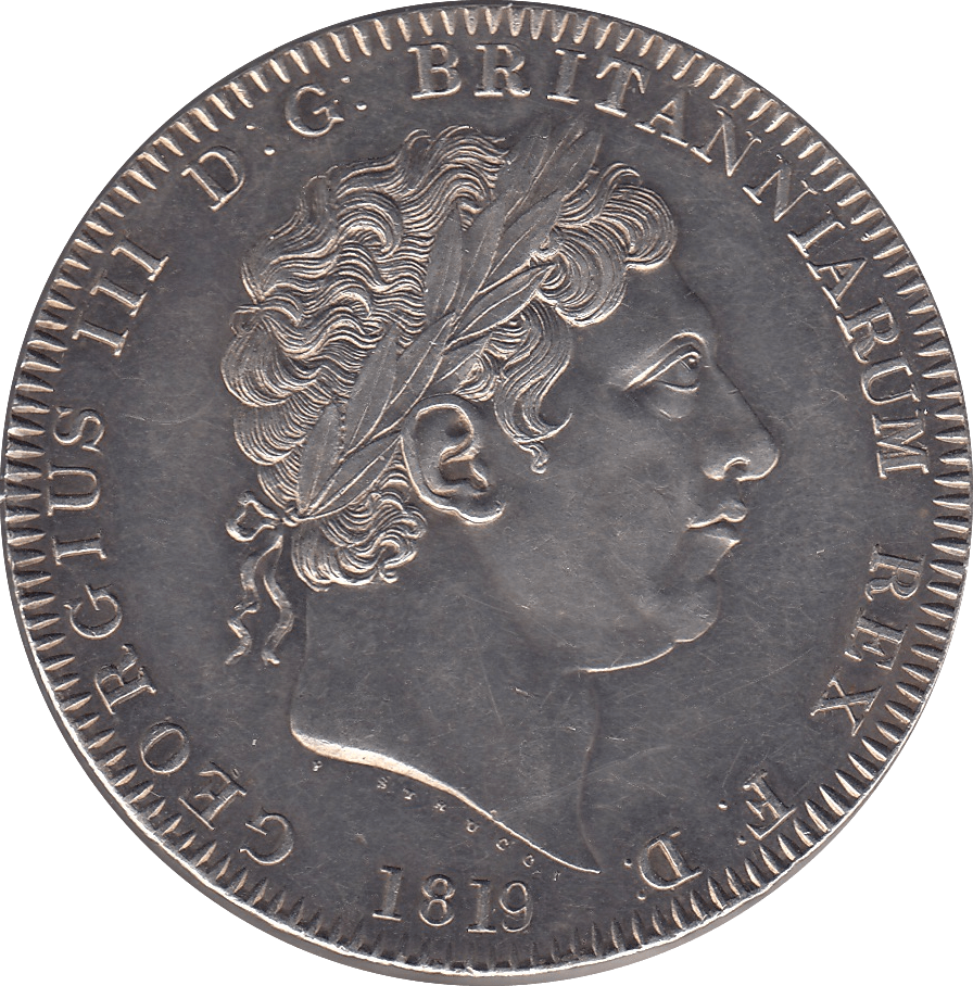 This 1819 Crown, struck during the reign of King George III, represents a rare and pristine example of British numismatic history from the early 19th century. The obverse features the laureate bust of King George III facing right, depicting the monarch during the fifty-ninth year of his reign. The reverse showcases a crowned shield adorned with the arms of the United Kingdom, symbolizing the union of England, Scotland, Ireland, and Hanover.