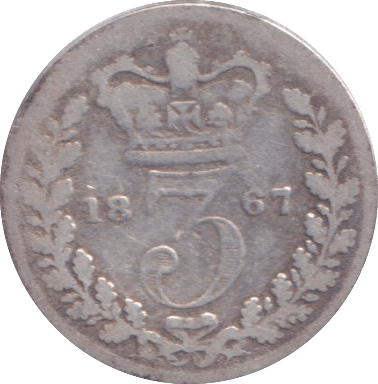 An 1867 threepence graded fine, presenting an excellent example of mid-Victorian silver coinage. This piece retains sharp definition across its design elements, with only light surface wear from its years in circulation. The fine condition allows collectors to appreciate the intricate details of Queen Victoria's portrait and the reverse inscription with clarity. A desirable addition for numismatists focusing on 1860s British currency or those seeking quality specimens at accessible price points within their collection parameters.