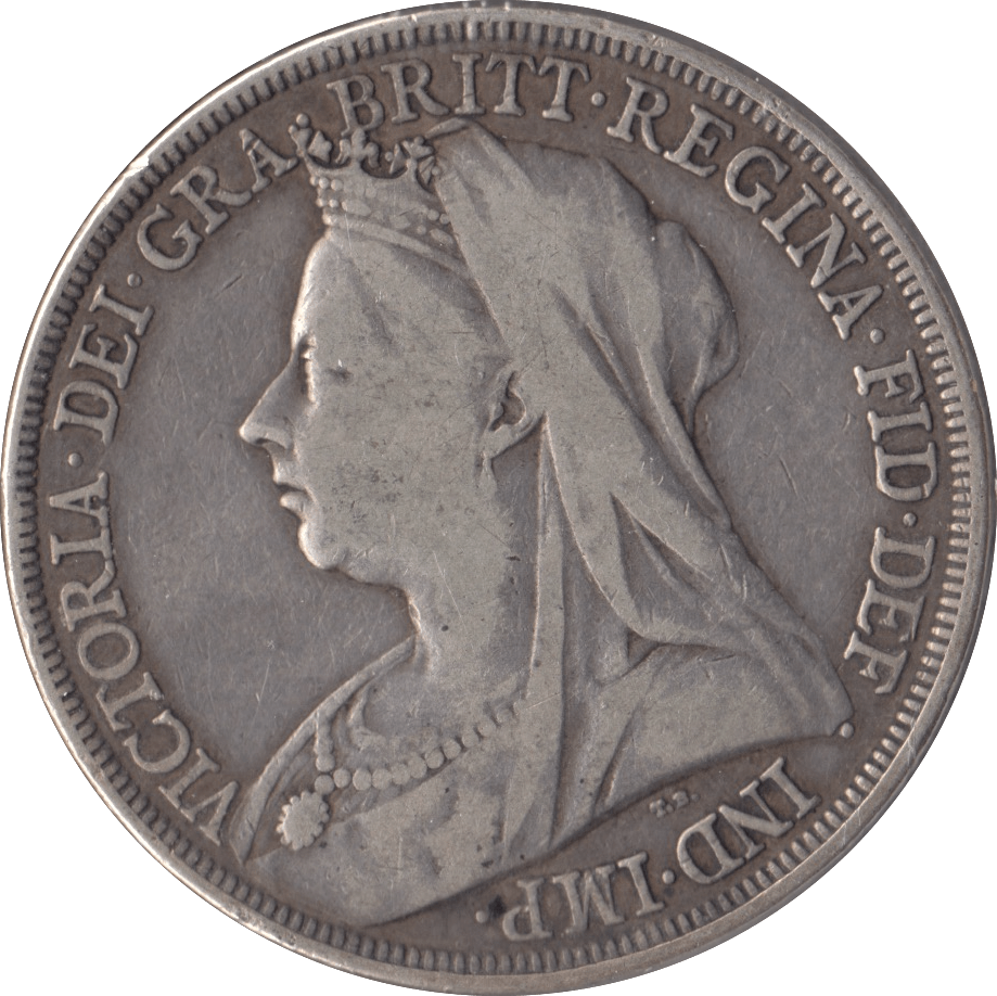 The 1890 Crown features Queen Victoria’s portrait on the obverse, symbolizing the latter part of her reign. This silver coin, graded as Good Fine (GF), displays clear details with moderate wear consistent with its age and circulation.