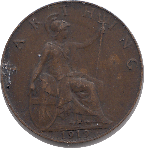 A scarce 1919 farthing in almost uncirculated condition, presenting excellent detail and lustre. This copper coin represents the final year of regular farthing production before the denomination's withdrawal from circulation. The reverse displays the wren design characteristic of early 20th-century farther coinage, whilst the obverse bears the portrait of King George V. An ideal addition for collectors pursuing complete date runs or those seeking quality examples of interwar British coinage.