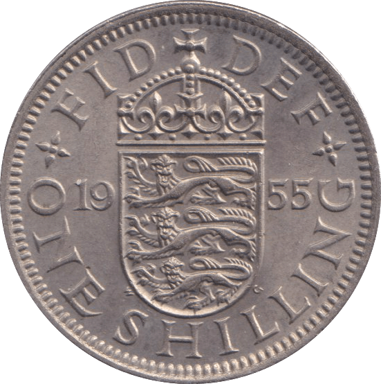 A premium English shilling from 1955 graded Almost Uncirculated, showcasing the Royal Arms within a shield with exceptional detail and minimal surface wear. This pre-decimal coin displays sharp strike quality with only the lightest handling marks, retaining near-original lustre across both surfaces. Dating from the mid-1950s, this represents a highly desirable example from the shilling's final two decades of circulation. An excellent acquisition for collectors seeking superior-grade specimens of this quintessential British denomination before decimalization transformed the currency system.
