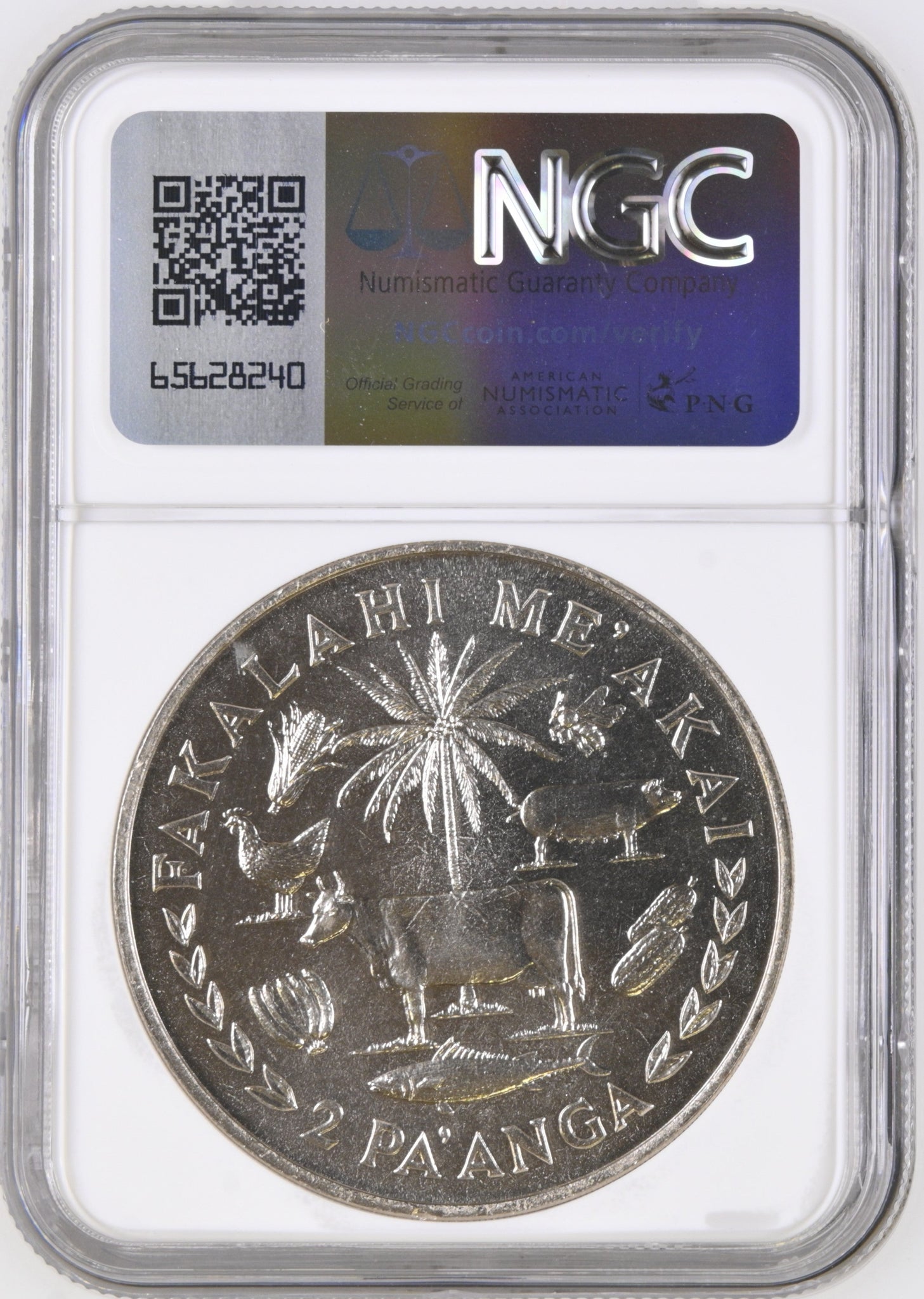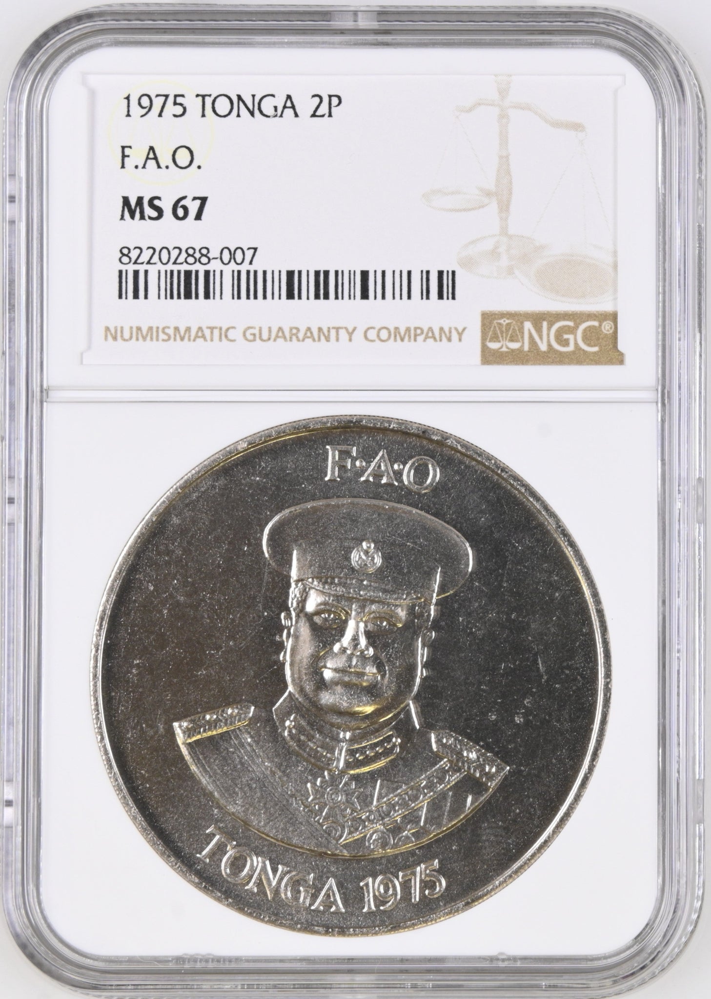 This 1975 silver Paanga Tonga coin, graded MS67 by NGC, features stunning palm trees and a high-quality finish. A rare and valuable addition to any collection, this coin is sure to impress both coin enthusiasts and numismatists alike.