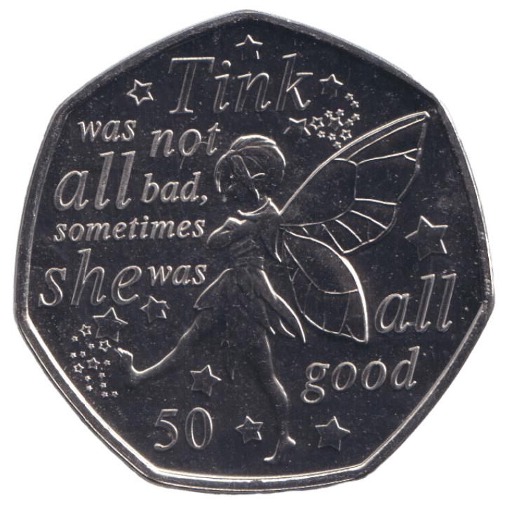Honour the mischievous fairy of Neverland with this 2020 Isle of Man 50p coin in brilliant uncirculated condition. The reverse showcases Tinker Bell in exquisite detail, capturing her enchanting presence and pivotal role in Peter Pan's adventures. Struck with meticulous craftsmanship, this BU specimen exhibits flawless surfaces and exceptional brilliance. A superb acquisition for collectors of literary commemoratives, fantasy-themed numismatics, or the complete Isle of Man Peter Pan series. This coin represents the pinnacle of modern coinage artistry, combining cultural significance with numismatic excellence—a treasured piece for discerning enthusiasts and devoted followers of J.M. Barrie's timeless narrative.