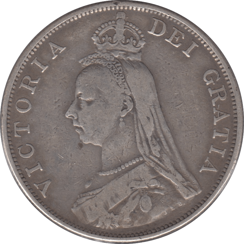 The 1888 Double Florin from the United Kingdom is a sterling silver coin minted during Queen Victoria’s reign, designed to simplify currency but often mistaken for the slightly smaller crown. The obverse features Queen Victoria wearing a crown and veil, symbolizing her role as Empress of India. On the reverse, a cruciform arrangement of shields represents England, Scotland, and Ireland, encircled by the Order of the Garter.