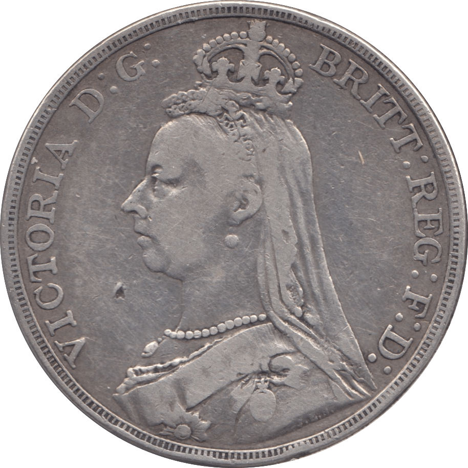The 1891 Crown features Queen Victoria’s portrait on the obverse, marking the later years of her reign. This silver coin, graded as Fine (F), displays noticeable wear throughout the design, including on the monarch’s features and the details of the crown.
