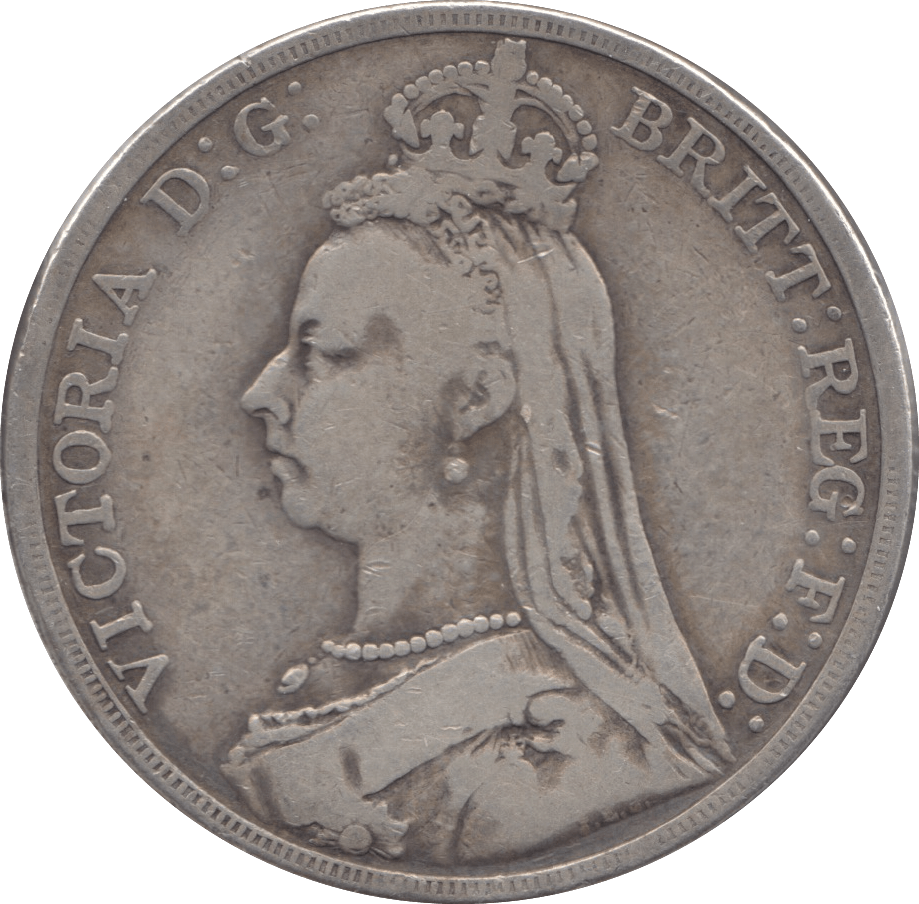 The 1891 Crown features Queen Victoria’s portrait on the obverse, marking the later years of her reign. This silver coin, graded as Fine (F), displays noticeable wear throughout the design, including on the monarch’s features and the details of the crown.