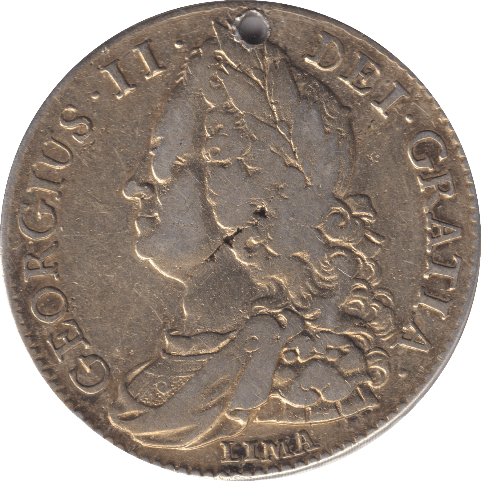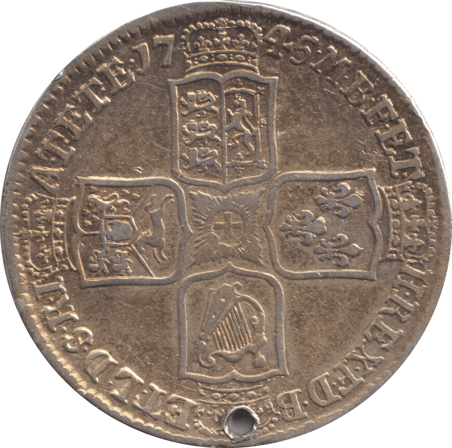 This 1745 Halfcrown exemplifies a transitional period in British monetary history, minted during George II's reign when the denomination remained essential to everyday commerce. Graded Good Fine, the coin displays balanced wear across both surfaces with legible inscriptions and recognisable portraiture. The deliberate hole piercing suggests historical repurposing—possibly as a talisman or decorative element—lending authentic provenance to the piece. Such modifications are characteristic of period artefacts that saw extended use beyond their original monetary function. An excellent specimen for collectors focused on Georgian silver or those documenting the practical life cycles of historical coinage.