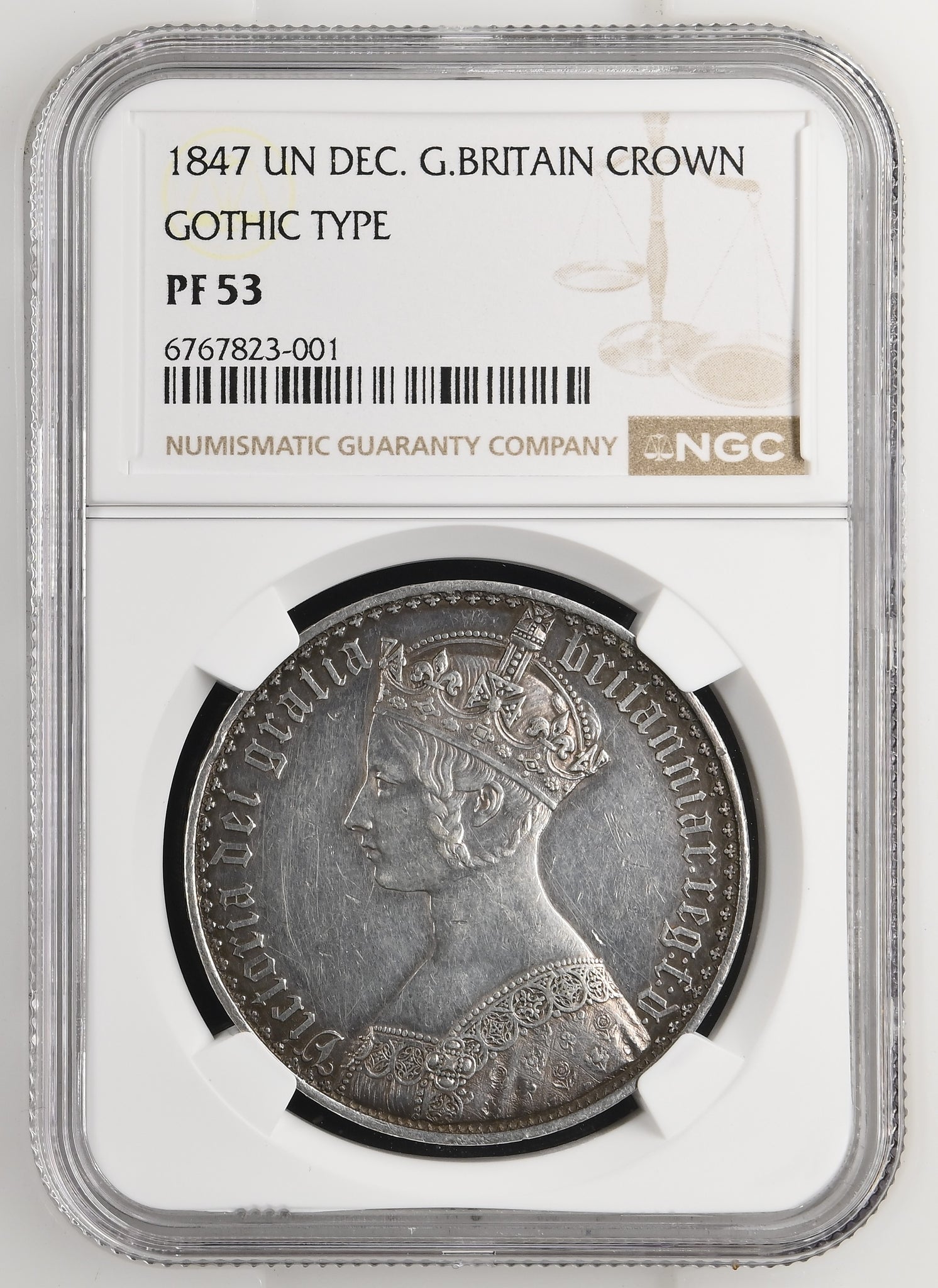 This exceptional 1847 Silver Gothic Type Crown represents a pinnacle of Victorian coinage artistry. Graded PF53, this proof specimen showcases the distinctive Gothic Revival design that characterised this brief but celebrated series. The reverse features the crowned shield within an ornate frame, whilst the obverse displays Queen Victoria's profile with characteristic precision. As a proof coin from this historically significant year, it offers collectors both numismatic rarity and aesthetic appeal. The PF53 grade indicates well-preserved surfaces with light handling marks consistent with its age. An outstanding addition to any serious Victorian silver collection.
