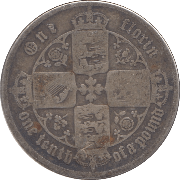 The 1853 Florin from the United Kingdom is a sterling silver coin minted during Queen Victoria’s reign, marking an early issue of the florin denomination. Introduced as part of the currency reform, the florin was valued at two shillings. The obverse of the coin features a portrait of Queen Victoria adorned with a crown and veil, symbolizing her as Empress of India. On the reverse, a cruciform arrangement of crowned shields represents England, Scotland, and Ireland.