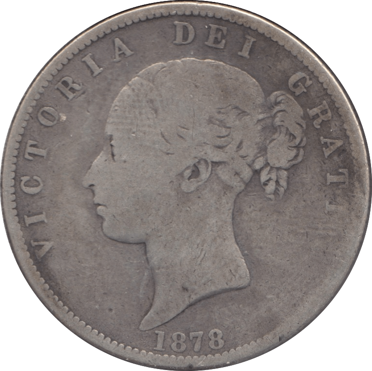 This 1878 Halfcrown is a notable piece of British numismatic history, struck during the reign of Queen Victoria. The obverse features the bust of Queen Victoria facing left, adorned with a laurel wreath. The reverse displays a crowned shield of the Royal Arms within a wreath of roses, thistles, and shamrocks, symbolizing the unity of England, Scotland, and Ireland.