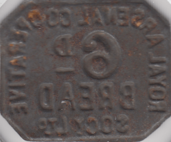 1890 SIXPENCE BREAD TOKEN ARSENAL COOPERATIVE