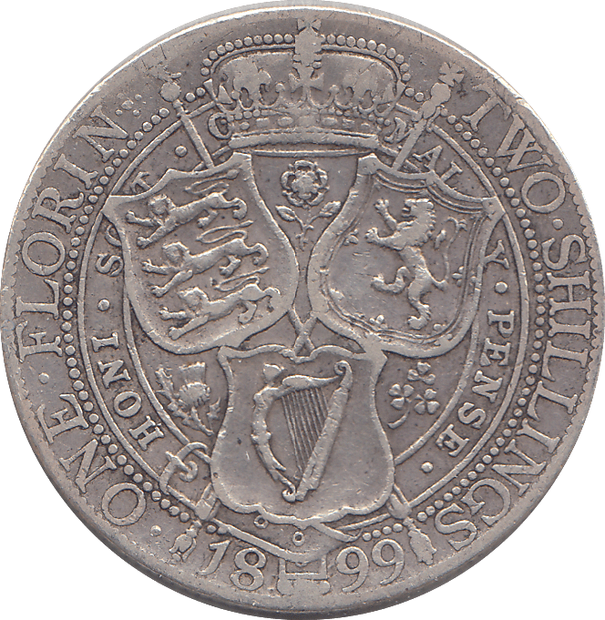 The 1899 Florin represents a significant piece of Victorian coinage, minted during the final year of Queen Victoria's reign. This two-shilling piece showcases the "Veiled Head" design, reflecting the period's refined numismatic artistry. The GF (Good Fine) condition indicates the coin retains considerable detail with minimal wear, making it an appealing addition to any collection of late 19th-century British currency. As a silver coin from this era, it holds both historical and intrinsic value for collectors and investors alike.