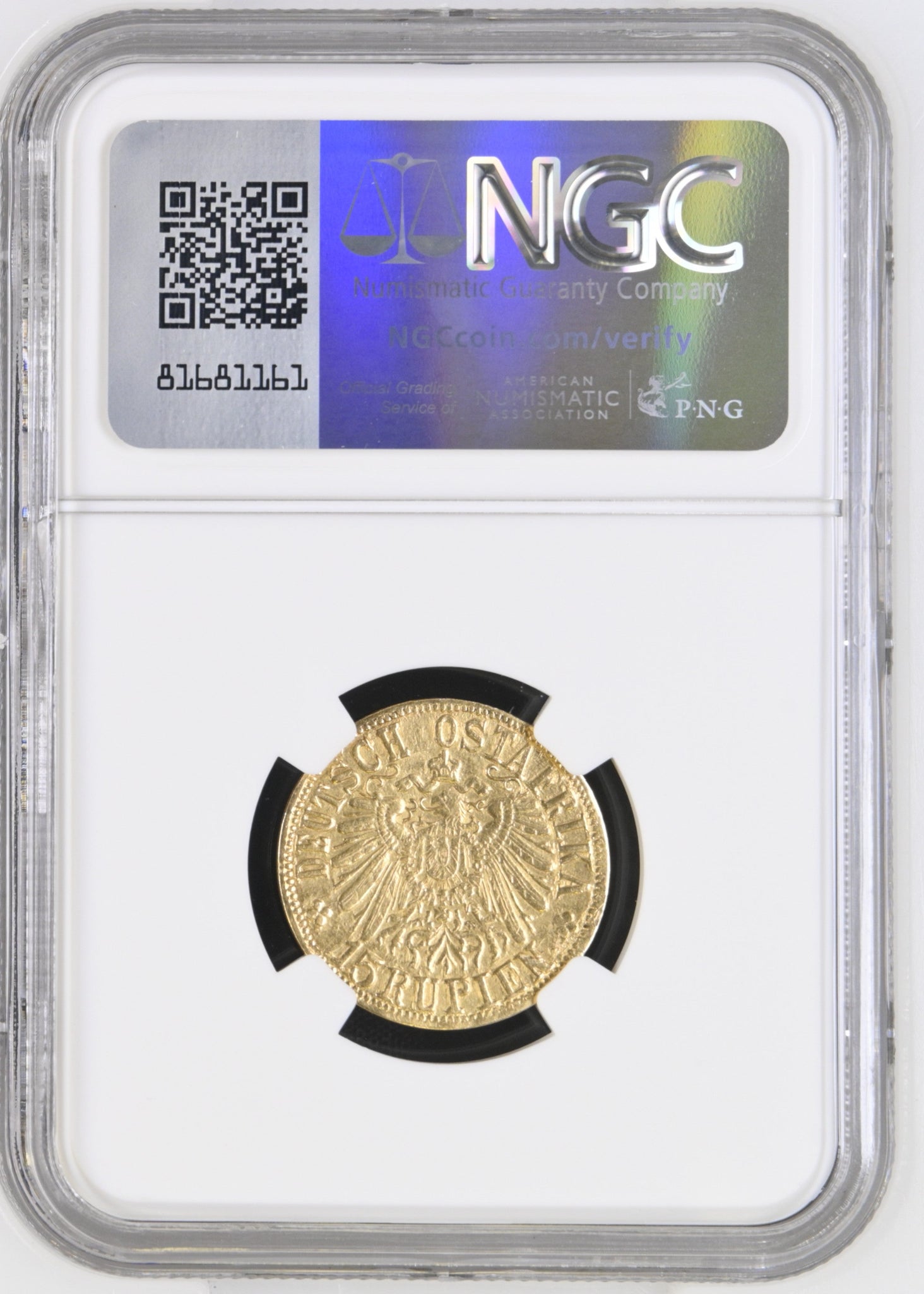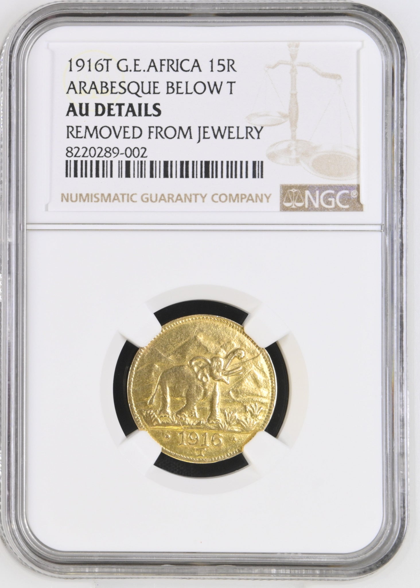 This 1916 15 Rupien German East Africa Arabesque coin has been graded and authenticated by NGC as AU condition. Featuring intricate arabesque detailing and a prominent "T" below, this coin is a must-have for any collector or history enthusiast. Own a piece of unique and expertly crafted German colonial currency.