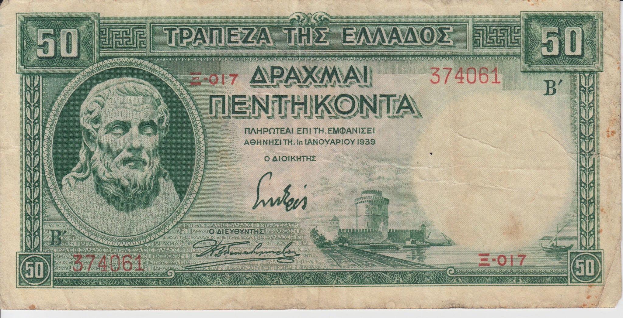 1939 50 DRACHMAI GREEK BANKNOTE REF 172