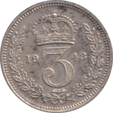 A scarce wartime Maundy threepence from 1943, graded in Extremely Fine condition. This small silver coin represents a fascinating piece of British numismatic history, struck during the Second World War when precious metal coinage remained in circulation. The Maundy threepence was traditionally distributed by the monarch on Maundy Thursday to the poor and deserving. This example displays sharp detail and minimal wear, making it an excellent addition to any collection of George VI coinage or wartime British currency.