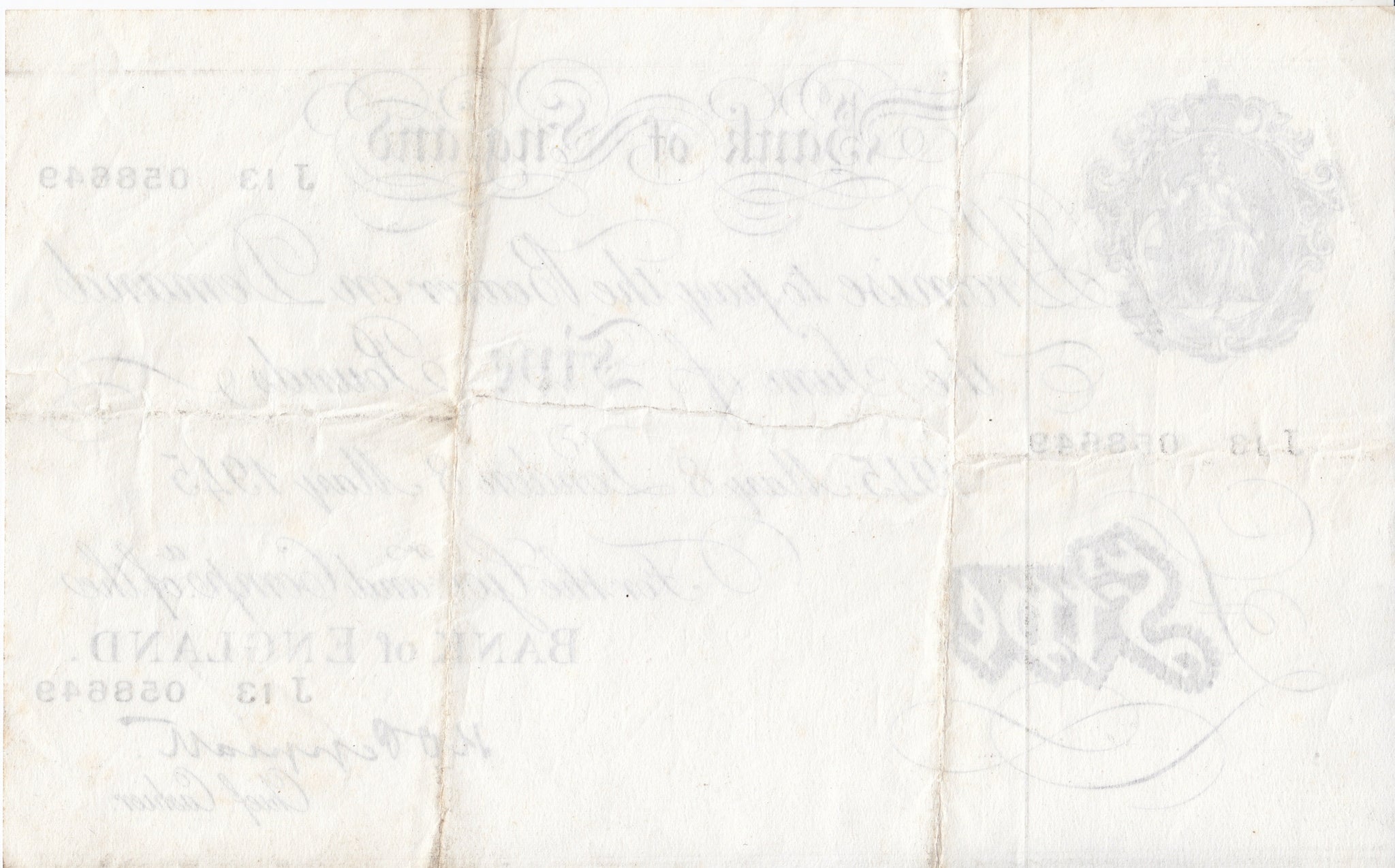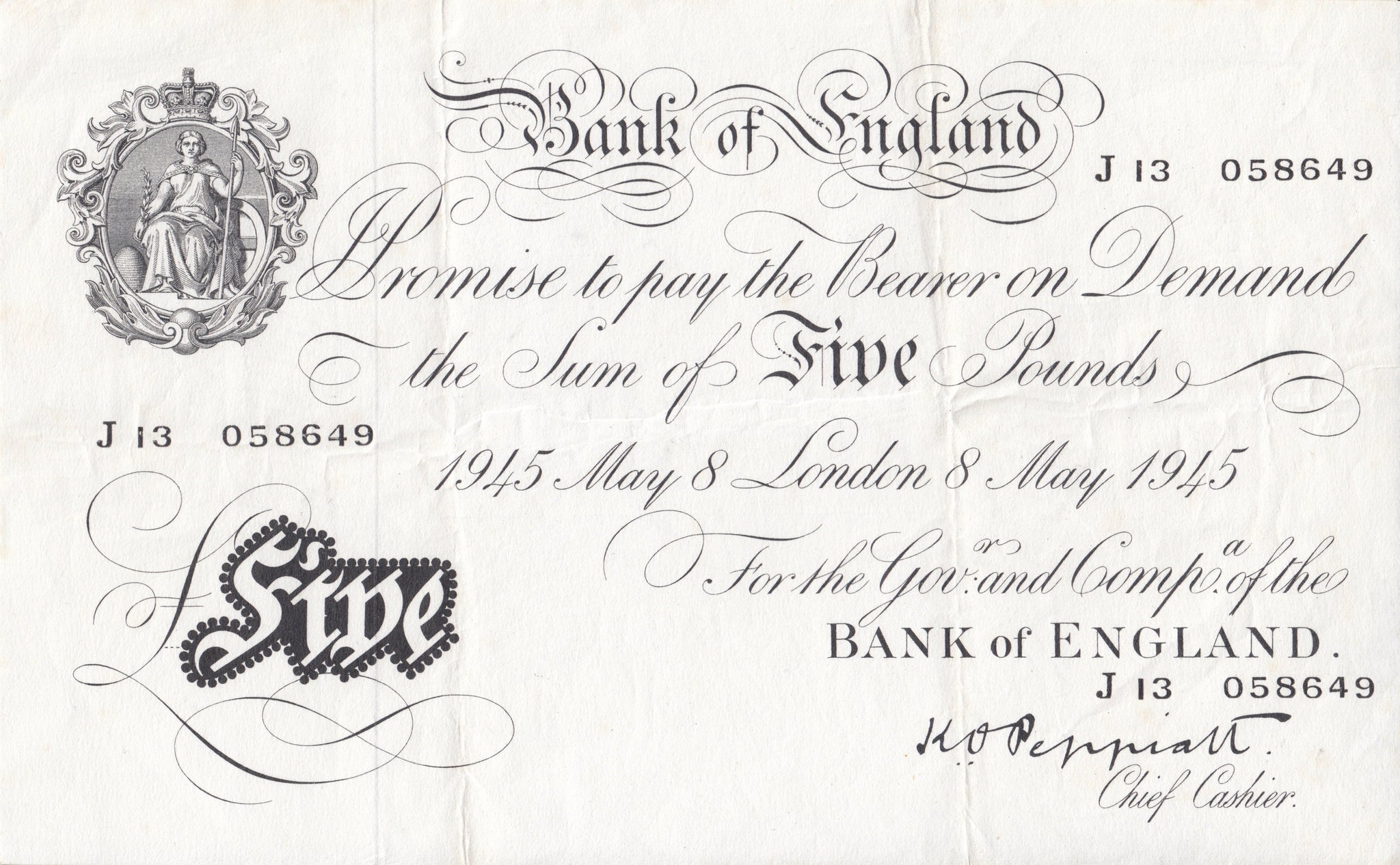 1945 WHITE FIVE POUND NOTE MAY 8TH BANK OF ENGLAND PEPPIATT W£5-9