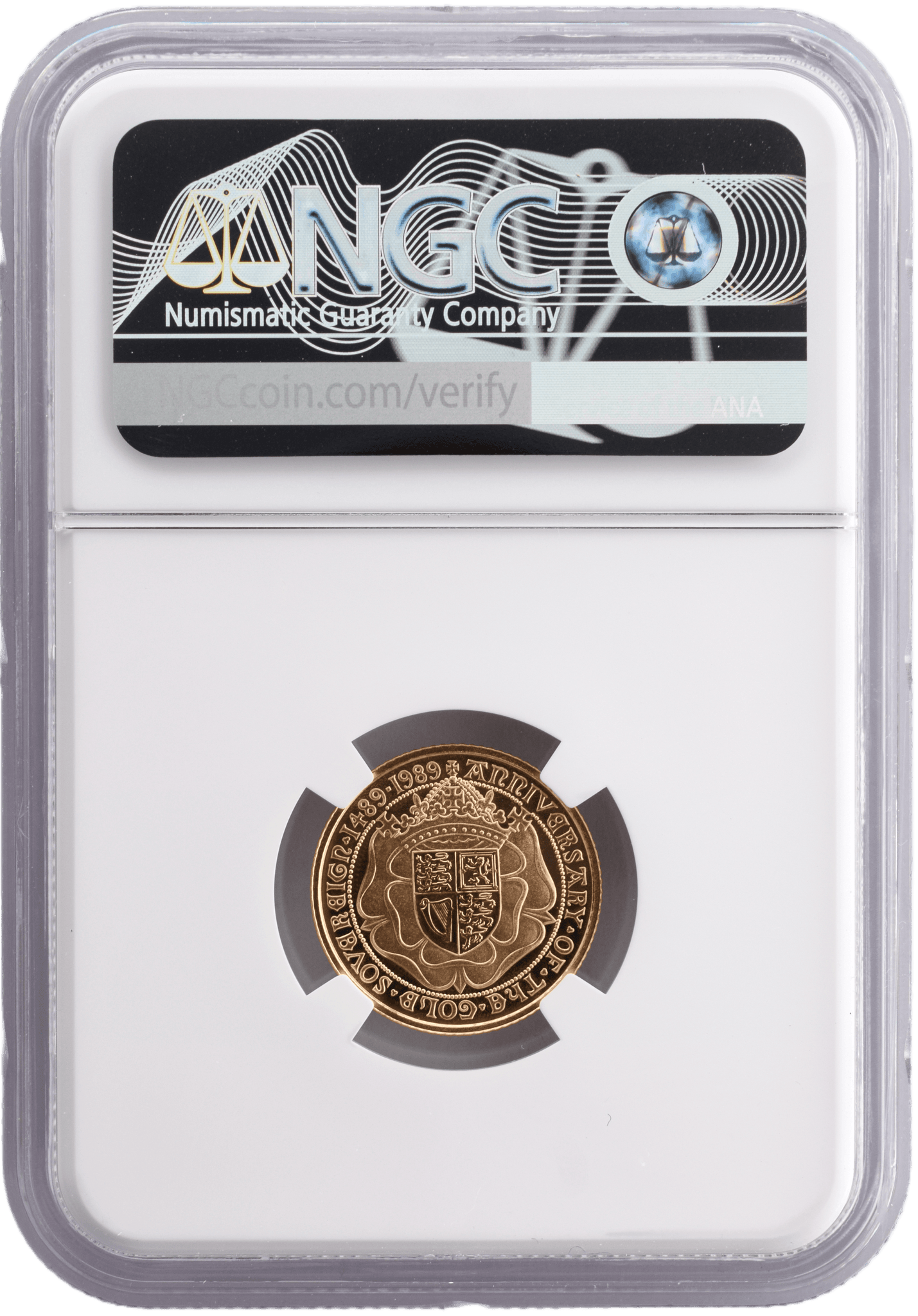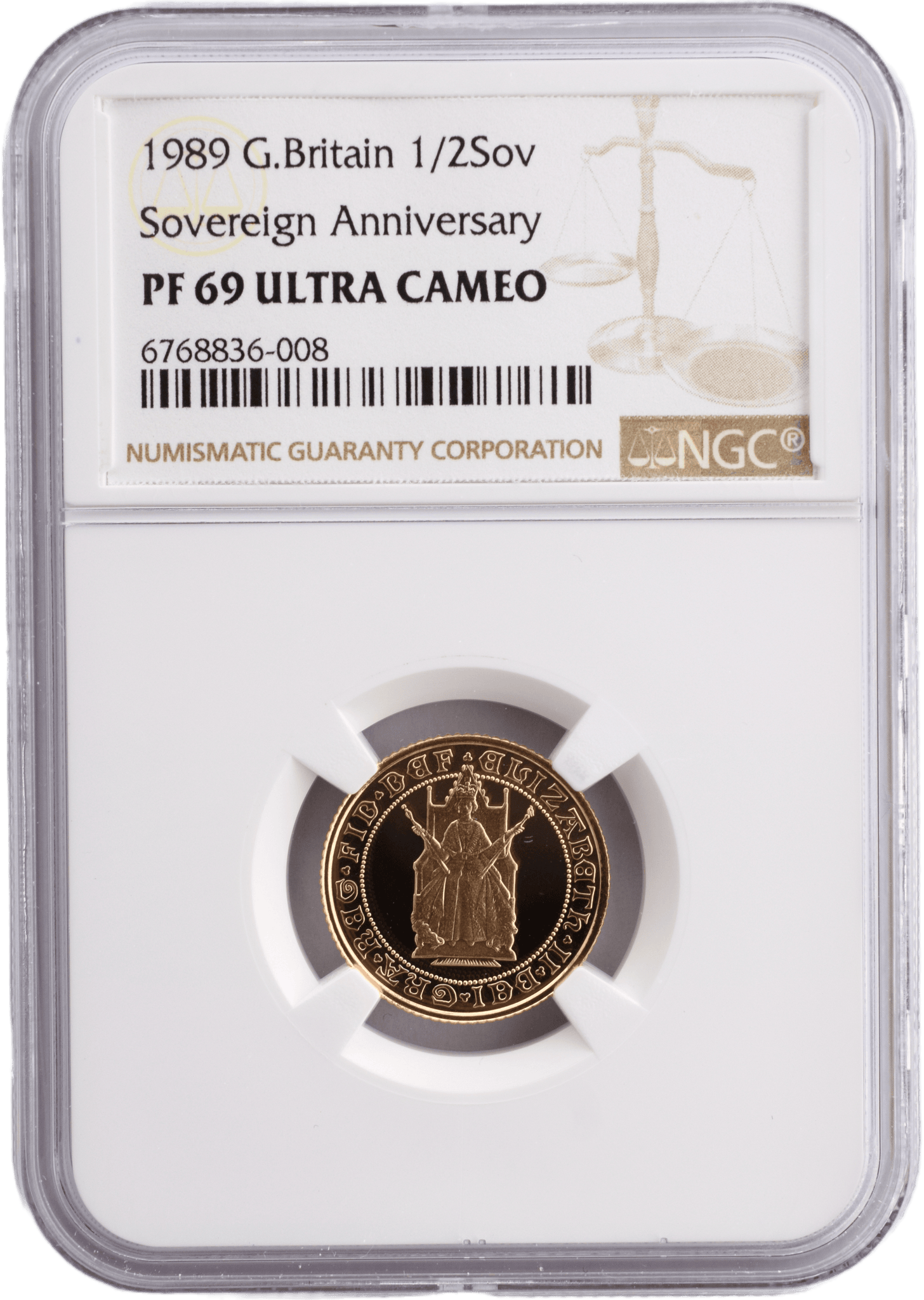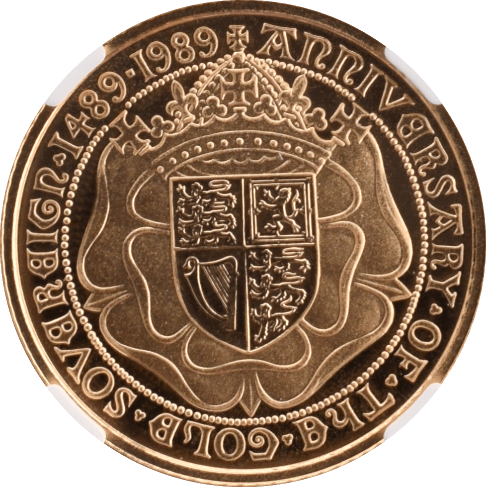 This 1989 Gold Proof Half Sovereign Anniversary Coin is a beautiful and rare collectable. It has been graded by the Numismatic Guaranty Corporation (NGC) and given a PF69 Ultra Cameo grade, one of the highest grades for coins of this type. It is also an excellent investment, as gold coins remain consistently valuable.