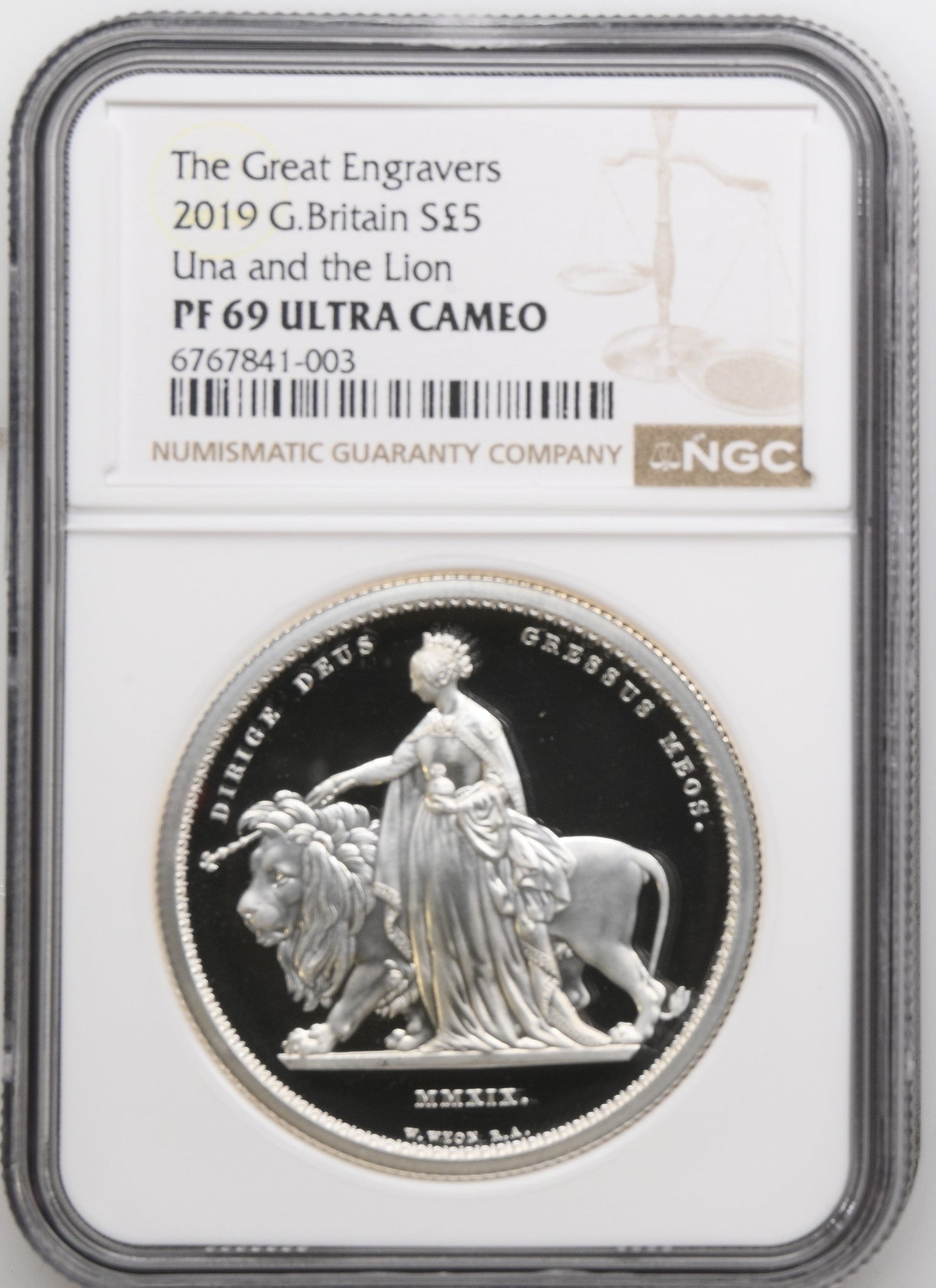Experience the majesty of this 2019 £5 Silver Proof two-ounce coin featuring the iconic Una and the Lion design, certified PF 69 Ultra Cameo by NGC. This substantial silver piece captures one of numismatics' most celebrated motifs with exceptional clarity and contrast—frosted heraldic detail set against pristine mirror fields. The two-ounce weight and premium silver content enhance its appeal to serious collectors and precious metals investors alike. A remarkable specimen combining historical artistry, modern proof technology, and authenticated quality in a highly sought-after format.