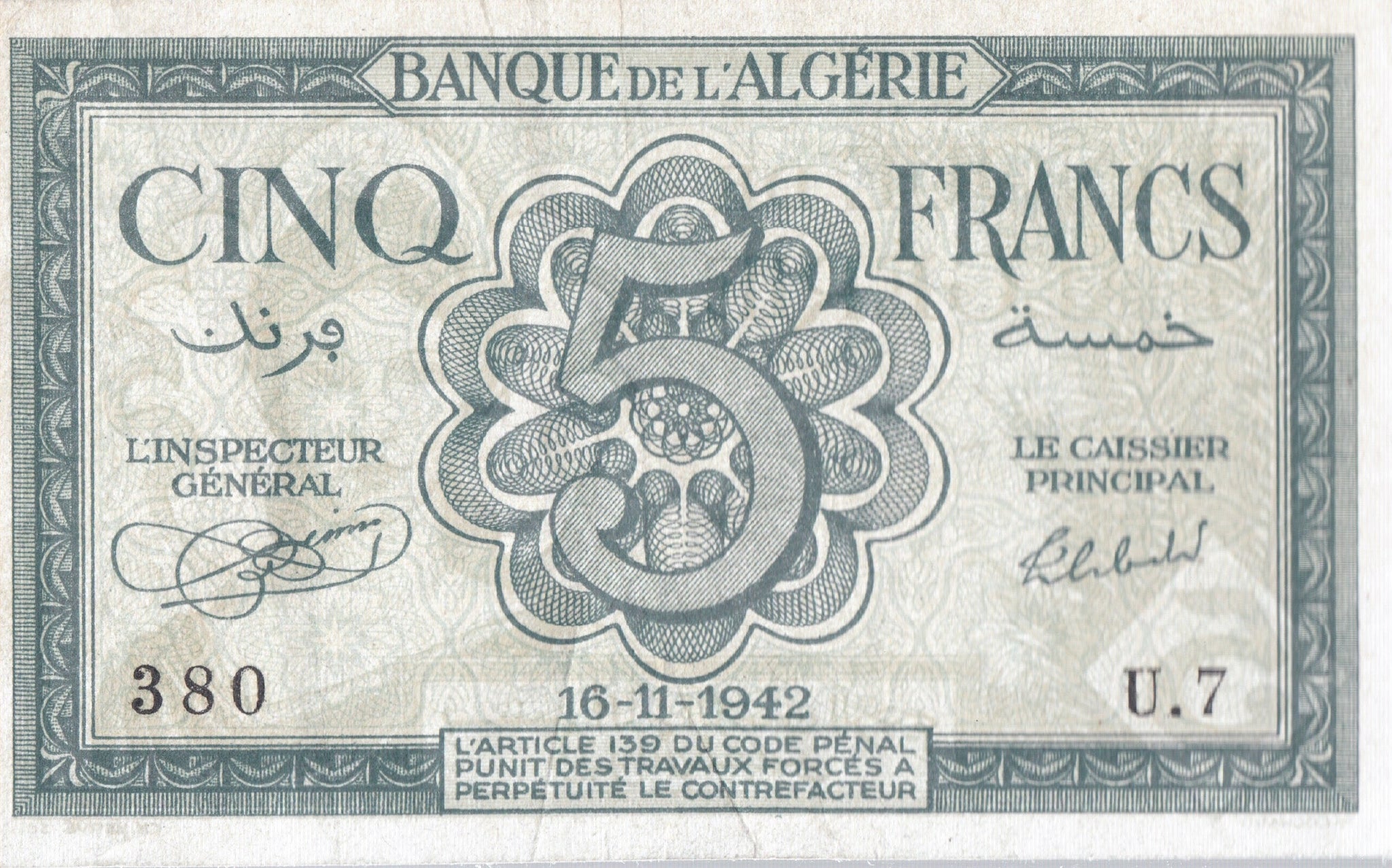 5 FRANCS BANQUE DE L'ALGERIE ALGERIAN BANKNOTE REF 7