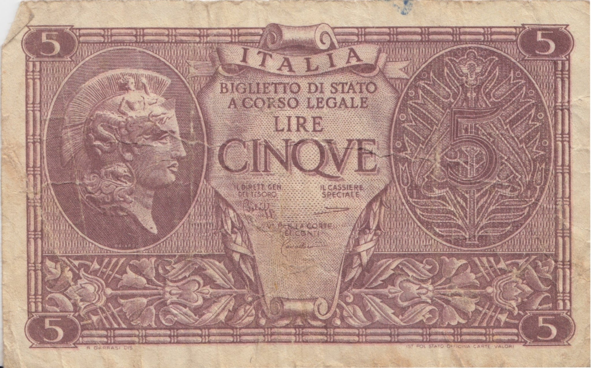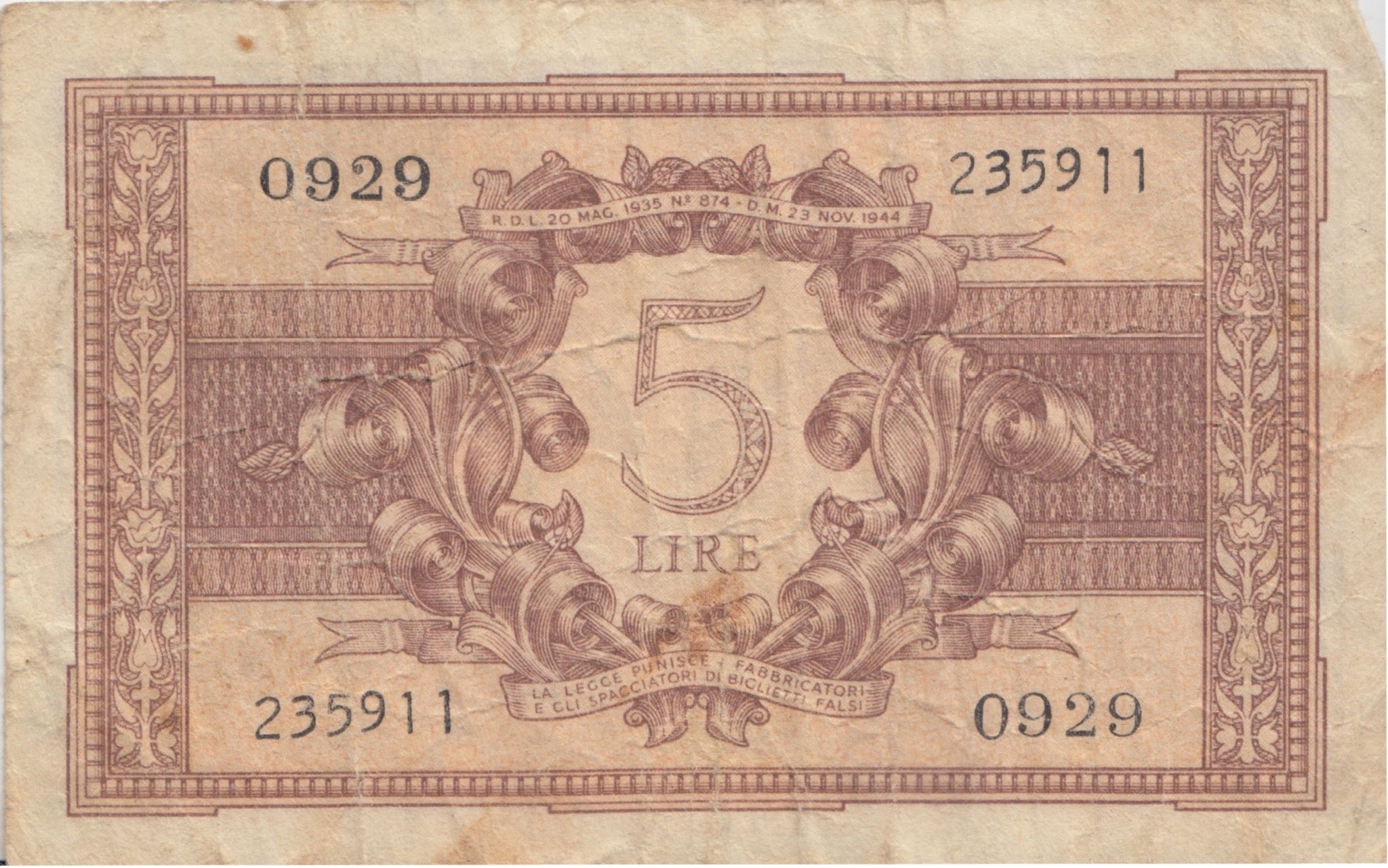 BANK OF ITALY 5 LIRE BANKNOTE REF 1567